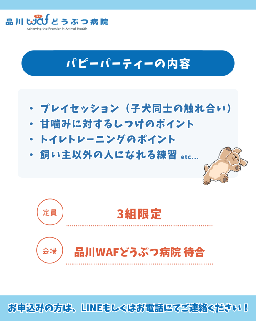 ◎予防について 最低一回以上の混合ワクチン接種がお済みの子にご参加いただけます。 当院以外で混合ワクチンを接種された場合は、ワクチン証明書をご持参ください。 また参加申込みは、今後当院で予防や診察を継続してくださる方に限らせていただきます。